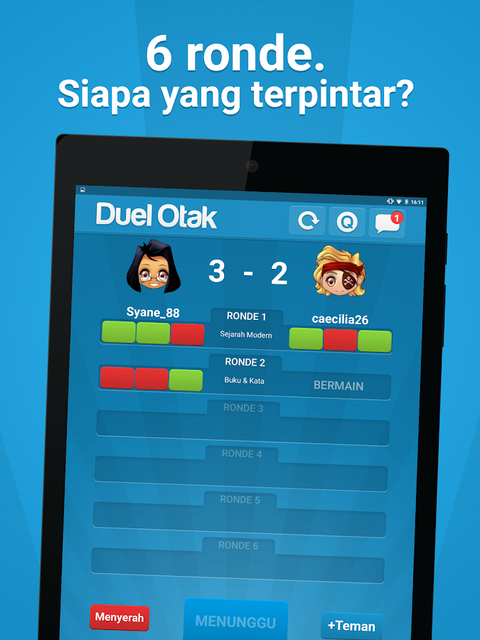 Duel Otak adalah game kuis pintar, penuh warna dan menyenangkan di mana kamu bisa menantang teman-temanmu dan pemain lainnya untuk berduel - dan lebih tahu fakta ajaib lainnya!